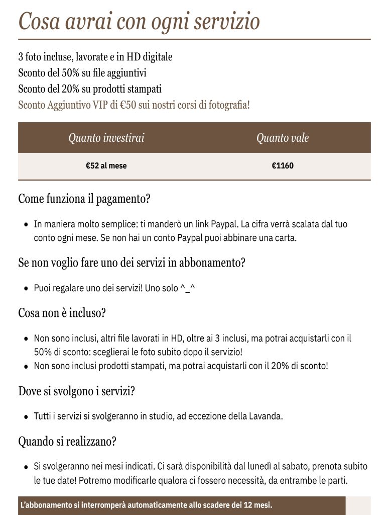 Ah! IMPORTANTISSIMO: ho solo 8 abbonamenti disponibili – non verranno venduti più di 8 abbonamenti, quindi…neanche ve lo dico: chi prima arriva, più foto avrà! <3